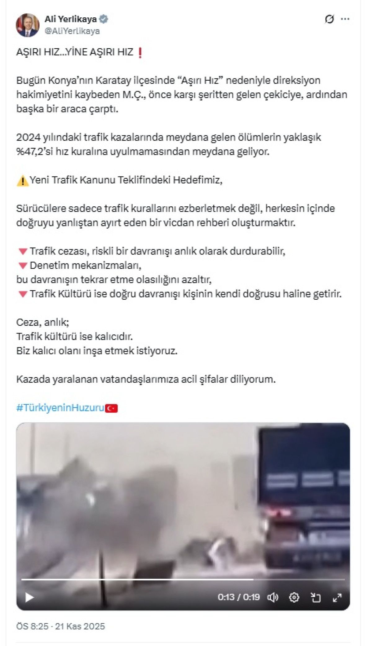 “Bugün Konya’nın Karatay ilçesinde ‘aşırı hız’ nedeniyle direksiyon hakimiyetini kaybeden M.Ç., önce karşı şeritten gelen çekiciye, ardından başka bir araca çarptı. 2024 yılındaki trafik kazalarında meydana gelen ölümlerin yaklaşık yüzde 47,2’si hız kuralına uyulmamasından meydana geliyor. Yeni Trafik Kanunu Teklifindeki hedefimiz, sürücülere sadece trafik kurallarını ezberletmek değil, herkesin içinde doğruyu yanlıştan ayırt eden bir vicdan rehberi oluşturmaktır. Trafik cezası, riskli bir davranışı anlık olarak durdurabilir, denetim mekanizmaları, bu davranışın tekrar etme olasılığını azaltır, trafik kültürü ise doğru davranışı kişinin kendi doğrusu haline getirir. Ceza, anlık; trafik kültürü ise kalıcıdır. Biz kalıcı olanı inşa etmek istiyoruz. Kazada yaralanan vatandaşlarımıza acil şifalar diliyorum”